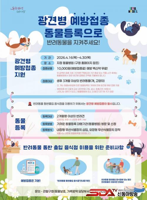 Á¶¼º¸í °­³²±¸Ã»ÀåÀº ¡°±¤°ßº´ ¿¹¹æÁ¢Á¾Àº ¹Ý·Áµ¿¹°ÀÇ °Ç°­Àº ¹°·Ð »ç¶÷°ú ÇÔ²² ¾ÈÀüÇÏ°Ô »ýȰÇϱâ À§ÇÑ ±âº»ÀûÀÎ ¿¹¹æÁ¶Ä¡¡±¶ó¸ç ¡°¹Ý·Áµ¿¹°°ú ÇÔ²² ½Ä´ç°ú °ø¿ø µî ÀÏ»ó °ø°£À» ÀÌ¿ëÇÏ´Â ÀÏÀÌ ´Ã°í ÀÖ´Â ¸¸Å­, À̹ø ¹«·á Áö¿ø»ç¾÷À» Àû±Ø Ȱ¿ëÇØ Á¤±âÁ¢Á¾°ú µ¿¹°µî·ÏÀ» ²À ì°ÜÁÖ½Ã±æ ¹Ù¶õ´Ù¡±°í ¸»Çß´Ù.