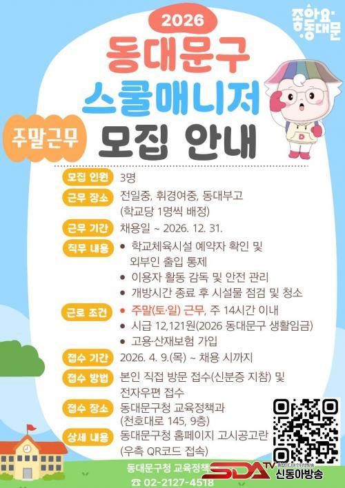 ÇöÀç ±¸´Â °¢ Çб³º° 1¸í¾¿ ÃÑ 3¸íÀÇ ½ºÄð¸Å´ÏÀú¸¦ ¸ðÁý ÁßÀÌ´Ù. ±Ù¹«ÀÏÀº ÁÖ¸»ÀÎ Å䡤ÀÏ¿äÀÏÀ̸ç, ±Ù·Î½Ã°£Àº ÁÖ 14½Ã°£ À̳»´Ù. ÀÓ±ÝÀº 2026³â µ¿´ë¹®±¸ »ýȰÀÓ±ÝÀÎ ½Ã±Þ 12,121¿øÀÌ Àû¿ëµÈ´Ù.