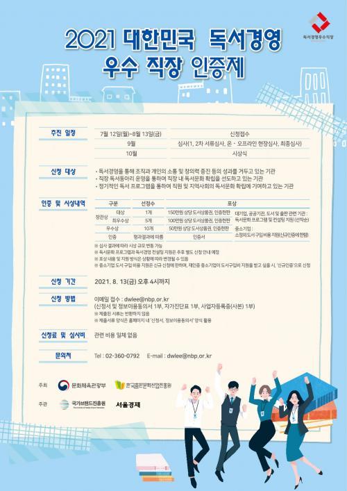 [½Åµ¿¾Æ¹æ¼Û=¾ÈÀº°æ ±âÀÚ] 7¿ù 12ÀÏ(¿ù)ºÎÅÍ 8¿ù 13ÀÏ(±Ý)±îÁö ±â¾÷°ú ±â°üÀ» ´ë»óÀ¸·Î ¡®2021³â µ¶¼­°æ¿µ ¿ì¼ö Á÷Àå ÀÎÁõ¡¯ ½ÅûÀ» ¹Þ´Â´Ù. À̹ø Çà»ç´Â ¹®È­Ã¼À°°ü±¤ºÎ(Àå°ü ȲÈñ)¿Í Çѱ¹ÃâÆÇ¹®È­»ê¾÷ÁøÈï¿øÀÌ ÁÖÃÖÇϰí (»ç)±¹°¡ºê·£µåÁøÈï¿ø°ú ¼­¿ï°æÁ¦½Å¹®ÀÌ ÁÖ¡¦