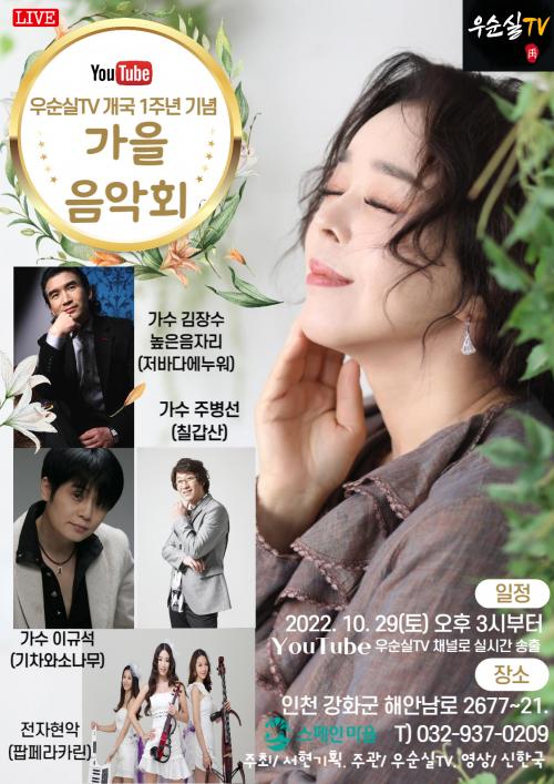 [½Åµ¿¾Æ¹æ¼Û=½Å°æ½Ä±âÀÚ] ¿ì¼ø½Ç TV °³±¹ 1Áֳ⠱â³ä °¡À» À½¾Çȸ°¡ °­È­µµ ½ºÆäÀθ¶À»¿¡¼­ 10¿ù 29ÀÏ Åä¿äÀÏ ¿ÀÈÄ 3½ÃºÎÅÍ 5½Ã±îÁö ÆîÃÄÁø´Ù. ¿ÃÇØ·Î °¡¼ö µ¥ºß 40ÁÖ³âÀ̱⵵ ÇÑ ¿ì¼ø½Ç °¡¼öÀÇ À¯Æ©ºê °³±¹ 1Áֳ⠰ø¿¬À» ÃàÇÏÇØÁÖ±â À§ÇØ µ¿·á °¡¼öµµ ÇÔ²² Ãâ¿¬ÇØ °ø¿¬¡¦
