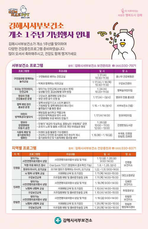 [½Åµ¿¾Æ¹æ¼Û´º½º=ÃÖ¼ÛÈ­±âÀÚ] ±èÇØ½Ã¼­ºÎº¸°Ç¼Ò°¡ 2024. 1. 15.(¿ù) ~ 2024. 1. 31.(¼ö)±îÁö °³¼Ò 1ÁÖ³âÀ» ¸ÂÀÌÇÏ¿© Áö¿ªÁֹΰú ÇÔ²²ÇÏ´Â ´Ùä·Î¿î ±â³äÇà»ç¸¦ ÁøÇàÇÑ´Ù°í ¹àÇû´Ù. ±èÇØ½Ã¼­ºÎº¸°Ç¼Ò´Â Áõ°¡ÇÏ´Â º¸°ÇÀÇ·á ¼ö¿ä¿¡ ¸ÂÃç ÁֹΠ¹ÐÂøÇü °Ç°­ÁõÁø»ç¾÷À» Ãß¡¦