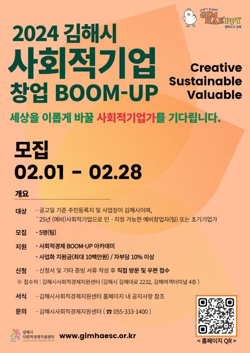 [½Åµ¿¾Æ¹æ¼Û´º½º=ÃÖ¼ÛÈ­±âÀÚ] ±èÇØ½Ã(½ÃÀå ȫſë)´Â ¡®2024³â »çȸÀû±â¾÷ â¾÷ BOOM-UP(ºÕ¾÷)¡¯¿¡ Âü¿©ÇÒ ¿¹ºñ, Ãʱâ â¾÷ÀÚ¸¦ ¸ðÁýÇÑ´Ù°í 2ÀÏ ¹àÇû´Ù. ÀÌ »ç¾÷Àº »çȸ¹®Á¦ ÇØ°á, Áö¿ª»çȸ °øÇå µî »çȸÀû °¡Ä¡¸¦ ½ÇÇöÇÒ ¼ö ÀÖ´Â ¿¹ºñ ¹× Ãʱâ â¾÷ÀÚ¸¦ ´ë»óÀ¸·Î ⡦