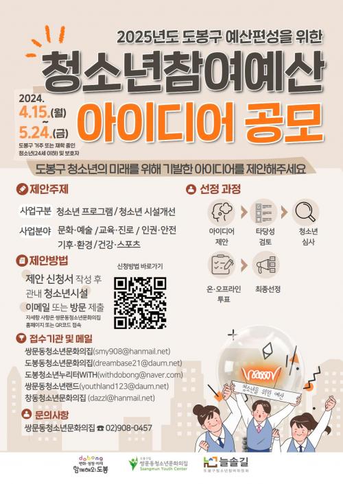 [½Åµ¿¾Æ¹æ¼Û µµºÀ±¸=À̽ŵ¿±âÀÚ]µµºÀ±¸°¡ ³»³âµµ ¿¹»êÆí¼ºÀ» À§ÇÑ ¡¸2024³â û¼Ò³âÂü¿©¿¹»ê ¾ÆÀ̵ð¾î °ø¸ð¡¹¸¦ 5¿ù 24ÀϱîÁö ÁøÇàÇÑ´Ù. û¼Ò³âÀÌ ÇÊ¿äÇÑ »ç¾÷À» Á÷Á¢ Á¦¾ÈÇÏ°í ¼±Á¤ÇÏ´Â ¡®Ã»¼Ò³âÂü¿©¿¹»êÁ¦¡¯´Â û¼Ò³âÀÇ ½ÇÁúÀûÀÎ Âü¿©¿Í ±Ç¸®¸¦ º¸ÀåÇϱâ À§ÇÑ Á¦µµ´Ù¡¦