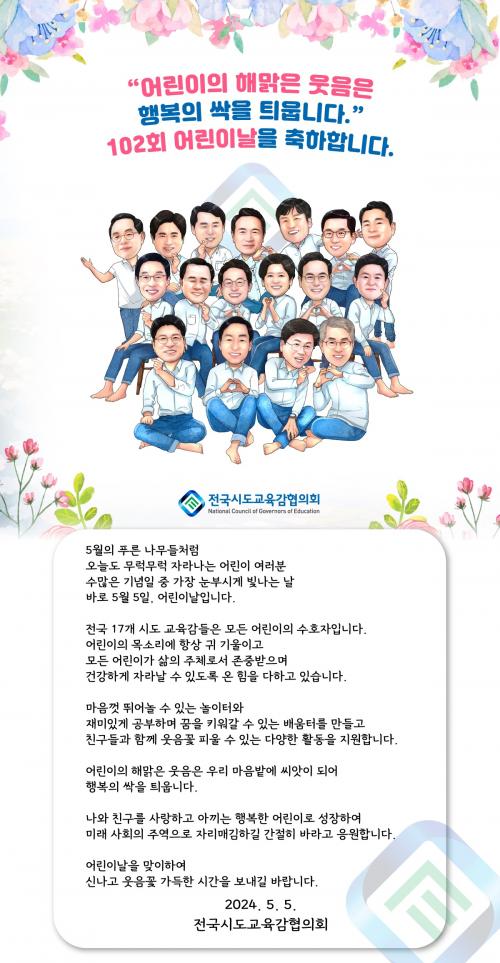 [½Åµ¿¾Æ¹æ¼Û=À̽ŵ¿±âÀÚ]Àü±¹½Ãµµ±³À°°¨ÇùÀÇȸ(ȸÀå Á¶Èñ¿¬ ¼­¿ïƯº°½Ã±³À°°¨)´Â Á¦102Áֳ⠾À̳¯À» ¸ÂÀÌÇÏ¿© Àü±¹ ¾î¸°À̵鿡°Ô µû¶æÇÑ ÃàÇÏ¿Í ÀÀ¿øÀÇ ÆíÁö¸¦ º¸³Â´Ù. 17°³ ½Ãµµ ±³À°°¨Àº ¾î¸°À̵éÀÇ ¼öÈ£ÀÚ¶ó¸ç, ¸ðµç ¾î¸°À̰¡ »îÀÇ ÁÖü·Î¼­ Á¸Áß¹Þ°í °Ç°­ÇÏ°Ô ¼º¡¦