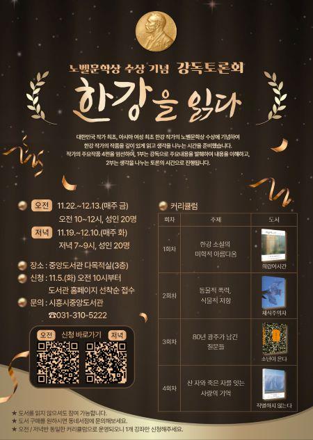 [½Åµ¿¾Æ¹æ¼Û ½ÃÈï½Ã=À̽ŵ¿±âÀÚ] ½ÃÈï½ÃÁß¾Óµµ¼­°üÀÌ ³ëº§¹®Çлó ¼ö»ó ÀÛ°¡ ÇѰ­ÀÇ ÀÛǰ¼¼°è¸¦ ޱ¸ÇÏ´Â ¡®ÇѰ­À» Àд١¯ °­µ¶Åä·Ðȸ¸¦ °³ÃÖÇÑ´Ù. À̹ø °­µ¶Åä·Ðȸ´Â 11¿ù 19ÀϺÎÅÍ 12¿ù 13ÀϱîÁö ÁøÇàµÇ¸ç ÇѰ­ ÀÛ°¡ÀÇ ´ëÇ¥ÀÛ 4Æí(¡¸Ã¤½ÄÁÖÀÇÀÚ¡¹,¡¸¼Ò³âÀÌ ¿Â´Ù¡¹, ¡¦
