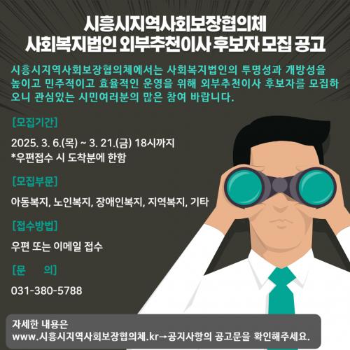 [½Åµ¿¾Æ¹æ¼Û ½ÃÈï½Ã=À̽ŵ¿±âÀÚ] ½ÃÈï½Ã Áö¿ª»çȸº¸ÀåÇùÀÇü´Â »çȸº¹Áö¹ýÀο¡¼­ »çȸº¹Áö¹ýÀÎÀÇ ¿î¿µ Åõ¸í¼º°ú °øÁ¤¼º °­È­¸¦ À§ÇØ ¿ÜºÎ Ãßõ ÀÌ»ç·Î Ȱµ¿ÇÒ Èĺ¸ÀÚ¸¦ 3¿ù 21ÀϱîÁö °ø°³ ¸ðÁýÇÑ´Ù. ½ÃÈï½Ã Áö¿ª»çȸº¸ÀåÇùÀÇü´Â ¡®»çȸº¹Áö»ç¾÷¹ý Á¦18Á¶ Á¦2Çס¯¿¡ ¡¦
