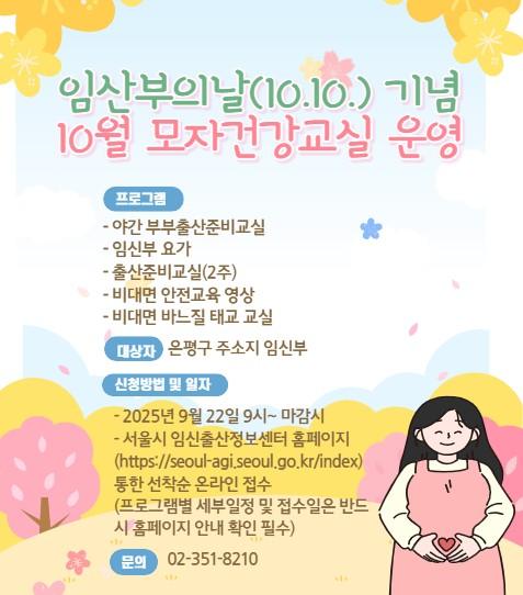 [½Åµ¿¾Æ¹æ¼Û ÀºÆò±¸=À̽ŵ¿±âÀÚ] ¼­¿ï ÀºÆò±¸´Â 10¿ù 10ÀÏ ¡®ÀÓ»êºÎÀÇ ³¯¡¯À» ±â³äÇØ º¸°Ç¼Ò¿¡¼­ ÀÓ»êºÎ¿Í °¡Á·À» À§ÇÑ ´Ù¾çÇÑ ¸ðÀڰǰ­±³½ÇÀ» ¿î¿µÇÑ´Ù°í ¹àÇû´Ù. À̹ø °Ç°­±³½ÇÀº Àӽš¤Ãâ»êÀÇ Ä£È­ÀûÀÎ »çȸºÐÀ§±â Á¶¼º°ú Áö¿ª ÀÓ»êºÎµéÀÇ °Ç°­ÇÑ Ãâ»ê°ú À°¾Æ ÁØ¡¦