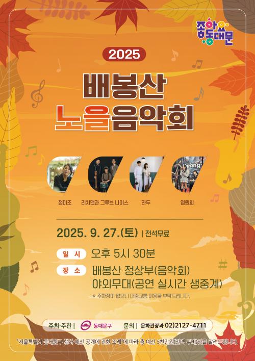 [½Åµ¿¾Æ¹æ¼Û µ¿´ë¹®±¸=À̽ŵ¿±âÀÚ] ¼­¿ï µ¿´ë¹®±¸´Â ¿À´Â 27ÀÏ ¡®2025 ¹èºÀ»ê ³ëÀ»À½¾Çȸ¡¯¸¦ °³ÃÖÇÑ´Ù°í ¹àÇû´Ù. ¿ÃÇØ ù¼±À» º¸ÀÌ´Â À̹ø À½¾Çȸ´Â µ¿´ë¹®±¸ÀÇ ´ëÇ¥ ¸í¼ÒÀÎ ¹èºÀ»ê Á¤»ó¿¡¼­ ¿­¸°´Ù. Àú¹«´Â ³ëÀ»°ú ÇÔ²² ÀçÁî¿Í º¸»ç³ë¹ÙÀÇ ¾Æ¸§´Ù¿î ¼±À²À» Áñ±æ ¼ö ÀÖ¡¦