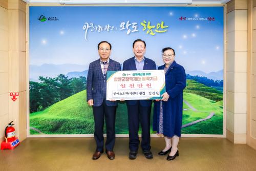 [½Åµ¿¾Æ¹æ¼Û °æ³²ÇÔ¾È=À̽ŵ¿±âÀÚ] Ä¥¿ø ÀξֳëÀκ¹Áö¼¾ÅÍ ±è»óÇÊ ¿øÀåÀº 1ÀÏ ÇԾȱºÃ»À» ¹æ¹®ÇØ Áö¿ªÀÎÀçÀ°¼ºÀ» À§ÇÑ ÀåÇбâ±Ý 1000¸¸ ¿øÀ» ±º ÀåÇÐÀç´Ü¿¡ ±âŹÇß´Ù. À̳¯ ±âŹ½Ä¿¡´Â ±è»óÇÊ ¿øÀå°ú ±è±âÈ­ ¼¾ÅÍÀåÀÌ Âü¼®ÇØ Áö¿ªÀÇ ±³À° ¹ßÀü°ú ÀÎÀç¾ç¼ºÀ» À§ÇÑ ¡¦