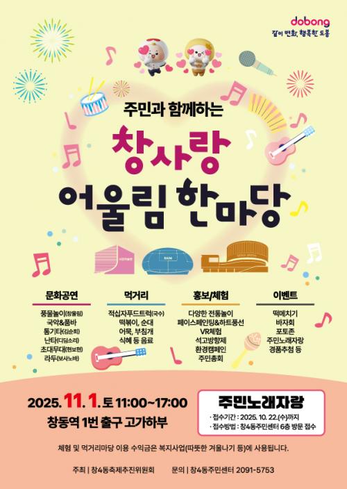 [½Åµ¿¾Æ¹æ¼Û µµºÀ±¸=À̽ŵ¿±âÀÚ] ¼­¿ï µµºÀ±¸ â4µ¿ÀÌ ¿À´Â 11¿ù 1ÀÏ ¿ÀÀü 11½Ã ⵿¿ª 1¹øÃⱸ °í°¡ÇϺΠÀÏ´ë¿¡¼­ ¡®Ã¢»ç¶û ¾î¿ï¸² ÇѸ¶´ç¡¯ ÃàÁ¦¸¦ °³ÃÖÇÑ´Ù. â4µ¿ ÃàÁ¦ÃßÁøÀ§¿øÈ¸°¡ ÁÖÃÖÇÑ À̹ø Çà»ç¿¡¼­´Â ÁֹΠ¸ðµÎ°¡ ¾î¿ï¸®°í Áñ±æ ¼ö ÀÖ´Â Áֹγ뷡ÀÚ¶ûÀÌ ¿­¡¦
