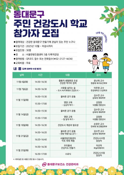 [½Åµ¿¾Æ¹æ¼Û µ¿´ë¹®±¸=À̽ŵ¿±âÀÚ] ¼­¿ï µ¿´ë¹®±¸´Â 11¿ù 4ÀϺÎÅÍ 25ÀϱîÁö ¸ÅÁÖ È­¿äÀϰú ±Ý¿äÀÏ, ¼­¿ïÇѹæÁøÈï¼¾ÅÍ 3Ãþ ´Ù¸ñÀû°­´ç¿¡¼­ 'ÁֹΠ°Ç°­µµ½ÃÇб³'¸¦ ¿î¿µÇÑ´Ù°í ¹àÇû´Ù. À̹ø ±³À°Àº °Ç°­ÇÑ µ¿´ë¹®±¸ ¸¸µé±â¿¡ °ü½ÉÀÌ ÀÖ´Â ÁֹΠ30¿© ¸íÀ» ´ë»óÀ¸·Î ÀÏ»ó¡¦