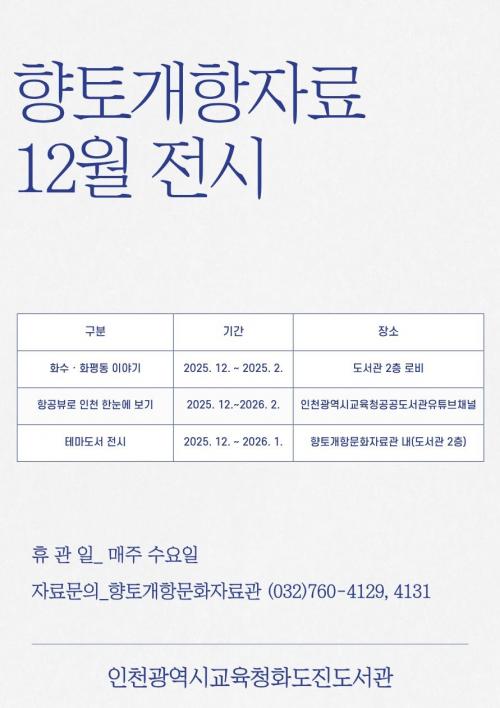 [½Åµ¿¾Æ¹æ¼Û ÀÎõ=À±¹Î½Ä±âÀÚ]ÀÎõ±¤¿ª½Ã±³À°Ã»È­µµÁøµµ¼­°ü(°üÀå ¹ÚÀºÁ¤)Àº ¿ÃÇØ 12¿ùºÎÅÍ 2026³â 1¿ù±îÁö Áö¿ª¹®È­¿Í ÇâÅäÀڷḦ ÁÖÁ¦·Î Àü½Ã ÇÁ·Î±×·¥À» ¿î¿µÇÑ´Ù. À̹ø Àü½Ã´Â ¡®È­¼ö¡¤È­Æòµ¿ À̾߱⡯, ¡®°³Ç×Àå µÑ·¯º¸±â¡¯, ¡®½ÃÀÎ ±è¿¬½Ä¡¯ µî ÀÎõ ¿øµµ½É ¿ª¡¦