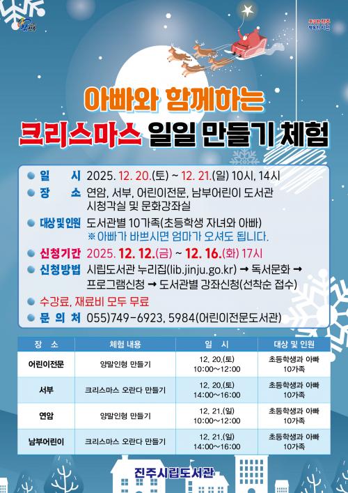 [½Åµ¿¾Æ¹æ¼Û °æ³²ÁøÁÖ=³²±Ã¿µ±â±âÀÚ] ÁøÁֽø³µµ¼­°üÀº ¡®¾Æºü¿Í ÇÔ²²ÇÏ´Â 2025³â Å©¸®½º¸¶½º ÀÏÀÏ ¸¸µé±â üÇ衯 Ư°­ Âü°¡ÀÚ¸¦ ¸ðÁýÇÑ´Ù. À̹ø Ư°­Àº ÃʵîÇлý ÀÚ³à¿Í ¾Æºü¸¦ ´ë»óÀ¸·Î ¿À´Â 20ÀÏ¿¡´Â ¡ã¾î¸°ÀÌÀü¹®µµ¼­°ü <¾ç¸»ÀÎÇü ¸¸µé±â> ¡ã¼­ºÎµµ¼­°ü <Å©¸®½º¸¶¡¦