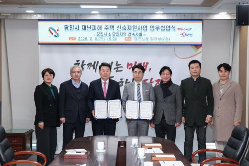 [½Åµ¿¾Æ¹æ¼Û=ÀÌÀçö±âÀÚ] ´çÁø½Ã´Â Áö³­ 5ÀÏ ´çÁø½Ãû ÇØ³ª·çȦ¿¡¼­ ´çÁøÁö¿ª °ÇÃà»çȸ(ȸÀå ¹Ú°æ°ü)¿Í Àç³­ ÇÇÇØ ÁÖÅà ½ÅÃàÁö¿øÀ» À§ÇÑ ¾÷¹«Çù¾àÀ» ü°áÇß´Ù°í 6ÀÏ ¹àÇû´Ù. À̹ø Çù¾à½ÄÀº ¿À¼ºÈ¯ ´çÁø½ÃÀå°ú ´çÁøÁö¿ª °ÇÃà»çȸ °ü°èÀÚµéÀÌ Âü¼®ÇÑ °¡¿îµ¥, È­Àç, ¼öÇØ¡¦