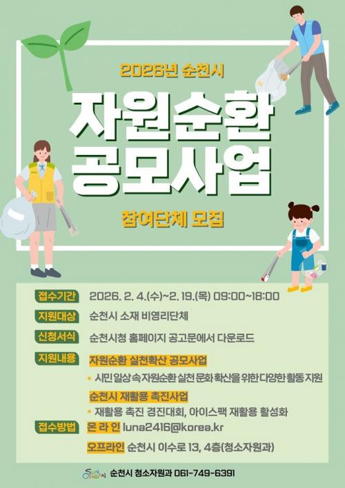 [½Åµ¿¾Æ¹æ¼Û ¼øÃµ=±è¿ëÈÆ ±âÀÚ] ¼øÃµ½Ã´Â ½Ã¹ÎÀÇ ÀÏ»ó ¼Ó ÀÚ¿ø¼øÈ¯ ¹®È­ È®»ê°ú ÀçȰ¿ë ½Çõ Ȱ¼ºÈ­¸¦ À§ÇØ 2026³â ÀÚ¿ø¼øÈ¯ °ø¸ð»ç¾÷ Âü¿© ´Üü¸¦ ¸ðÁýÇÑ´Ù°í ¹àÇû´Ù. À̹ø °ø¸ð»ç¾÷Àº 2026³â 3¿ùºÎÅÍ 12¿ù±îÁö ÃßÁøµÇ¸ç, ¡®ÀÚ¿ø¼øÈ¯ ½Çõ È®»ê °ø¸ð»ç¾÷¡¯°ú ¡®¼øÃµ¡¦
