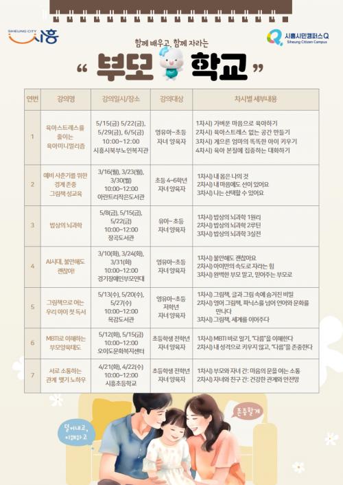 [½Åµ¿¾Æ¹æ¼Û ½ÃÈï½Ã=À̽ŵ¿±âÀÚ] ½ÃÈï½Ã(½ÃÀå ÀÓº´ÅÃ)´Â ÀÌ´ÞºÎÅÍ ¿À´Â 6¿ù±îÁö °ü³» Çкθð ¹× ¿¹ºñ Çкθ𸦠´ë»óÀ¸·Î ºÎ¸ð ¿ª·® °­È­¸¦ À§ÇÑ ¡®Ã£¾Æ°¡´Â ºÎ¸ðÇб³¡¯¸¦ ÃÑ 7°³ °úÁ¤, 20ȸ¿¡ °ÉÃÄ ¿î¿µÇÑ´Ù. ½Ã´Â ü°èÀûÀÎ ºÎ¸ð±³À° ±â¹Ý ¸¶·ÃÀ» À§ÇØ 2023³âºÎÅÍ ºÎ¡¦