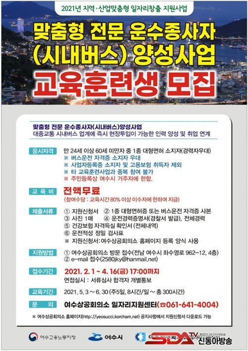 [½Åµ¿¾Æ¹æ¼Û=±è±â³² ±âÀÚ] ¿©¼ö½Ã(½ÃÀå ±Ç¿ÀºÀ)´Â 2021³â °í¿ë³ëµ¿ºÎ ÀÏÀÚ¸® °ø¸ð»ç¾÷À¸·Î ÃßÁøÇÏ´Â ¡®¸ÂÃãÇü Àü¹® ¿î¼öÁ¾»çÀÚ ¾ç¼º»ç¾÷¡¯ ±³À° ÈÆ·Ã»ý 25¸íÀ» 4¿ù 16ÀϱîÁö ¸ðÁýÇÑ´Ù°í ¹àÇû´Ù.