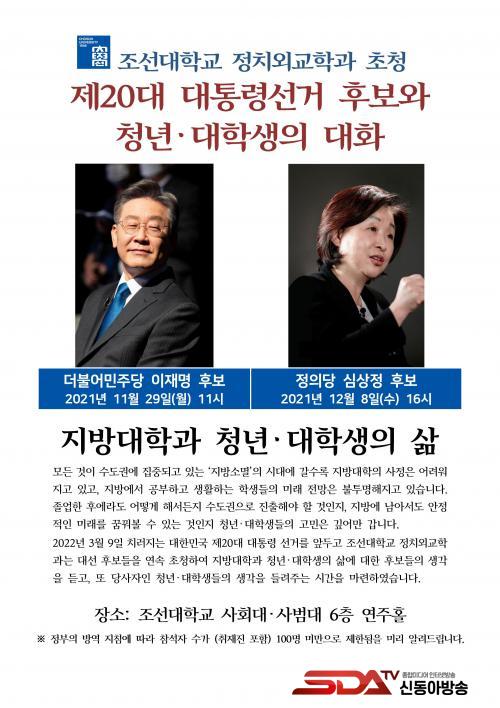 ¿À´Â 29ÀÏ(¿ÀÀü 11½Ã)°ú 12¿ù 8ÀÏ(¿ÀÈÄ 4½Ã) Á¶¼±´ëÇб³ »çȸ´ë¡¤»ç¹ü´ë 6Ãþ ¿¬ÁÖȦ¿¡¼ ÁøÇàµÇ´Â ´ë¼± Èĺ¸ ÃÊû ´ëÈÀÇ ½Ã°£Àº Áö¹æ´ëÇÐÀÇ À§±â ¼Ó û³â°ú ´ëÇлýµéÀÇ °í¹Î°ú È帵éÀÇ »ý°¢À» ³ª´©´Â ½Ã°£À¸·Î ÁøÇàµÈ´Ù.
