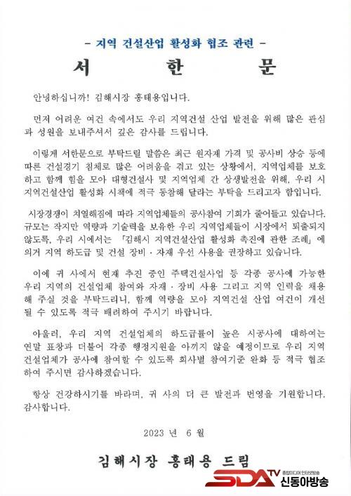 [½Åµ¿¾Æ¹æ¼Û´º½º=¾çÇýÁö±âÀÚ] È«ÅÂ¿ë ±èÇØ½ÃÀåÀº Áö³ 5ÀÏ °ü³» °Ç¼³°ø»ç ÁßÀÎ À¯°ü±â°ü 4°³¼Ò ¹× 19°³¼Ò ´ëÇü°Ç¼³ÇöÀå º»»ç¿¡ Áö¿ª°Ç¼³»ê¾÷ ¹ßÀü¿¡ ÈûÀ» º¸Å´޶ó´Â ³»¿ëÀÇ ¼Çѹ®À» Àü´ÞÇß´Ù°í ¹àÇû´Ù.