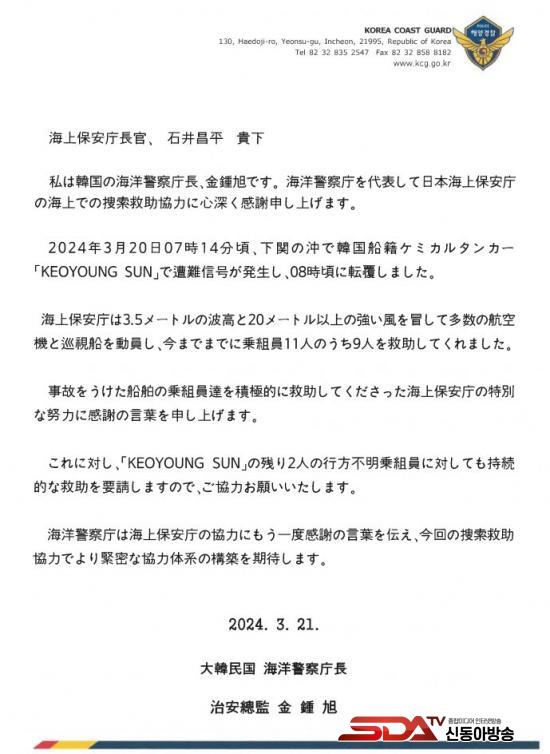[½Åµ¿¾Æ¹æ¼Û ÀÎõ=À±¹Î½Ä±âÀÚ]ÇØ¾ç°æÂûûÀº 20ÀÏ ¹ß»ýÇÑ Çѱ¹¼±Àû ȹ°¼±(½Â¼±¿ø 11¸í) Àüº¹ »ç°í¿¡ ´ëÇØ ÀϺ» ÇØ»óº¸¾ÈûÀÇ ½Â¼±¿ø ¼ö»ö¡¤±¸Á¶ ÇùÁ¶¿¡ ´ëÇÑ °¨»çÀÇ ¸¶À½À» ´ã¾Æ ¼Çѹ®À» º¸³Â´Ù°í 21ÀÏ ¹àÇû´Ù.